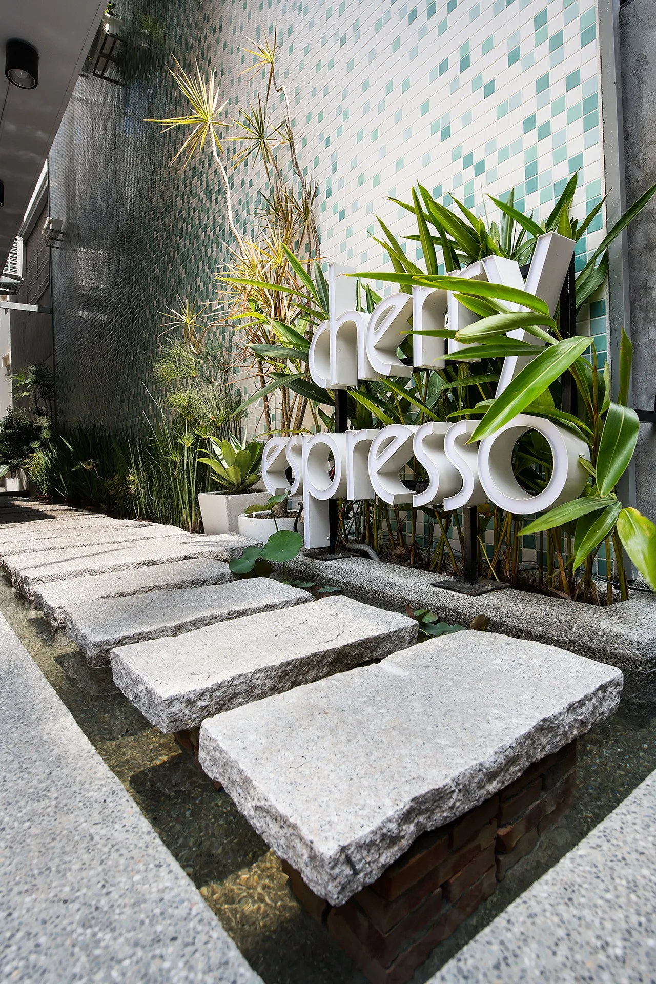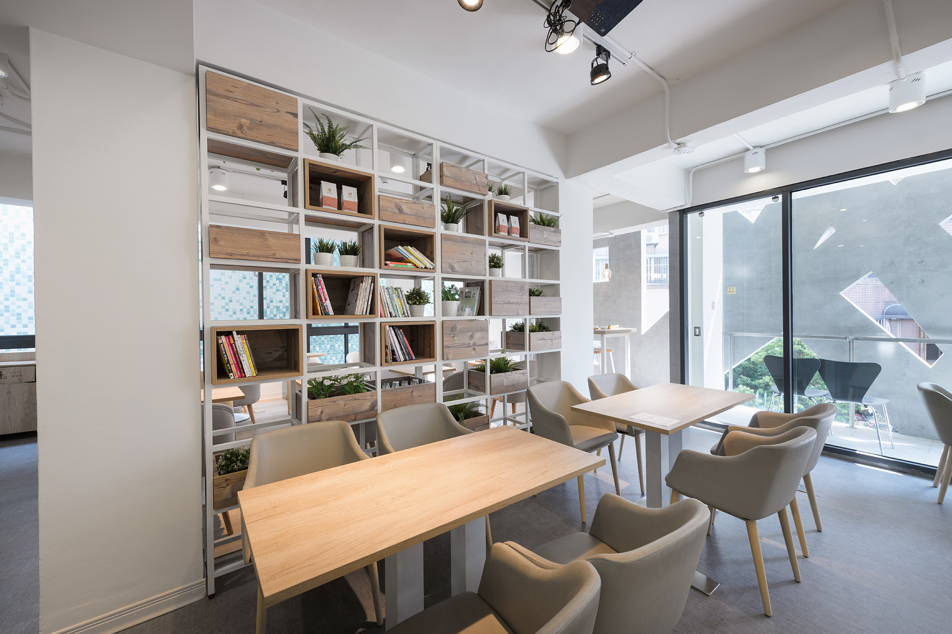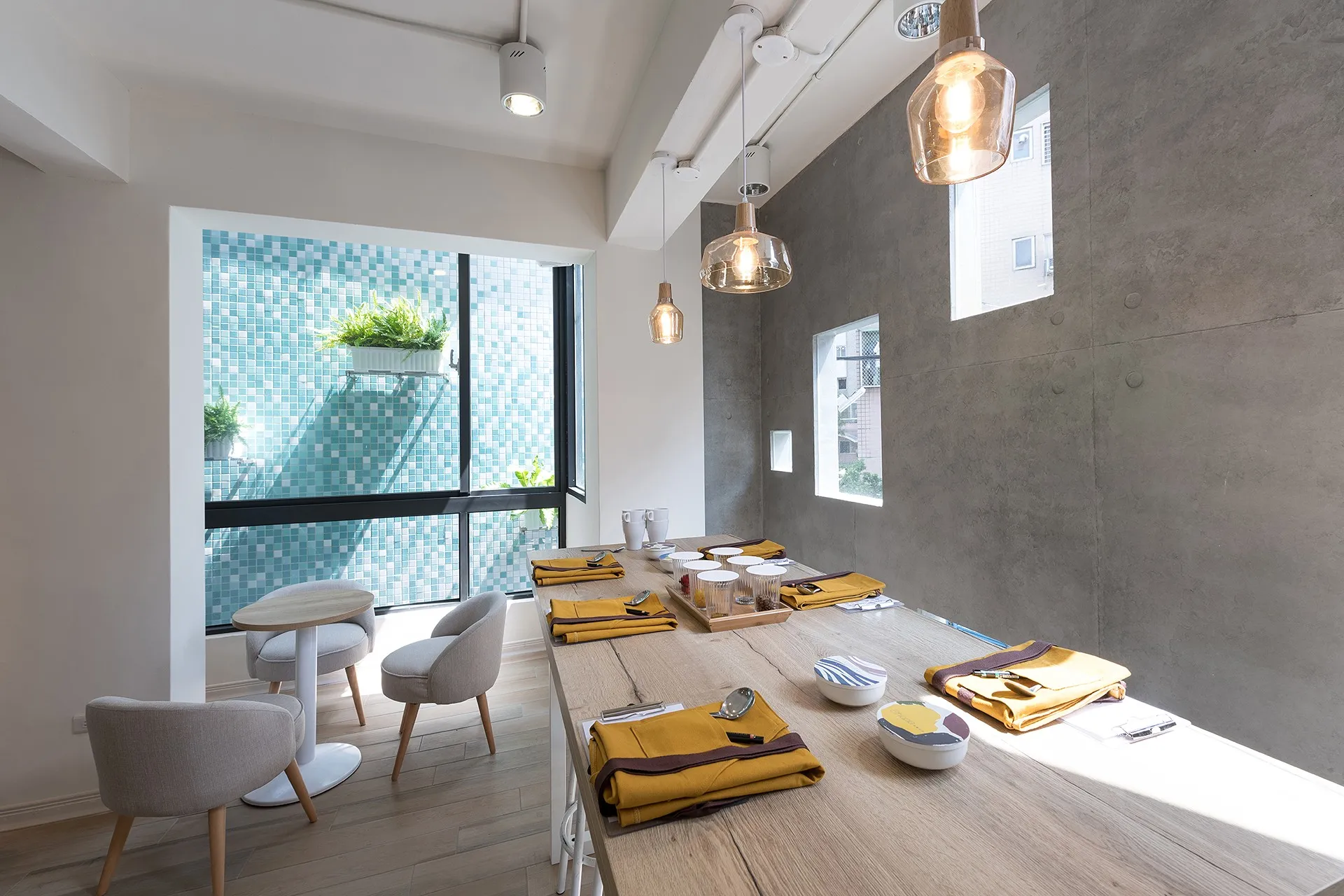 清水模牆面、大片玻璃與庭院綠意,讓入口不會像一般套房那麼生硬。客人抵達時,看到的是咖啡館的明亮日常,也比較容易對短租住宿產生安心感。